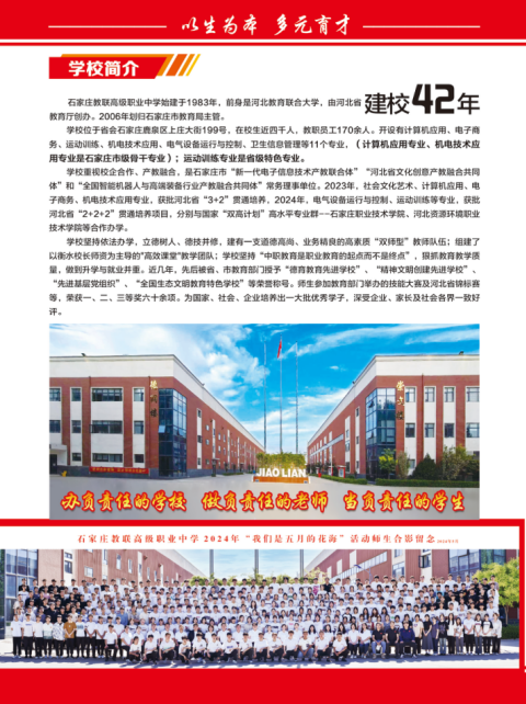 石家莊教聯(lián)高級職業(yè)中學(xué),作為省級重點中學(xué),自 1983 年創(chuàng)立以來,建校42年,始終致力于為學(xué)生提供優(yōu)質(zhì)的職業(yè)教育與升學(xué)渠道。2025 年秋季招生現(xiàn)已全面開啟,期待有志青年的加入!